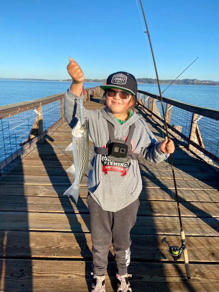 My first ever fish was on a line my dad put out at Fort Baker Pier. We were dropping a crab pot off the pier and my dad put out a small rod with a worm. I saw it move and reeled up a tiny striped perch! It was so beautiful! A couple weeks later my dad and I went to Albany Bulb near our house and using squid we caught a few baby leopard sharks and baby bay rays! I was so amazed by them! A week later using pile worms we got 8 black perch at the same place! That was it. I was hooked! Loved the tug!